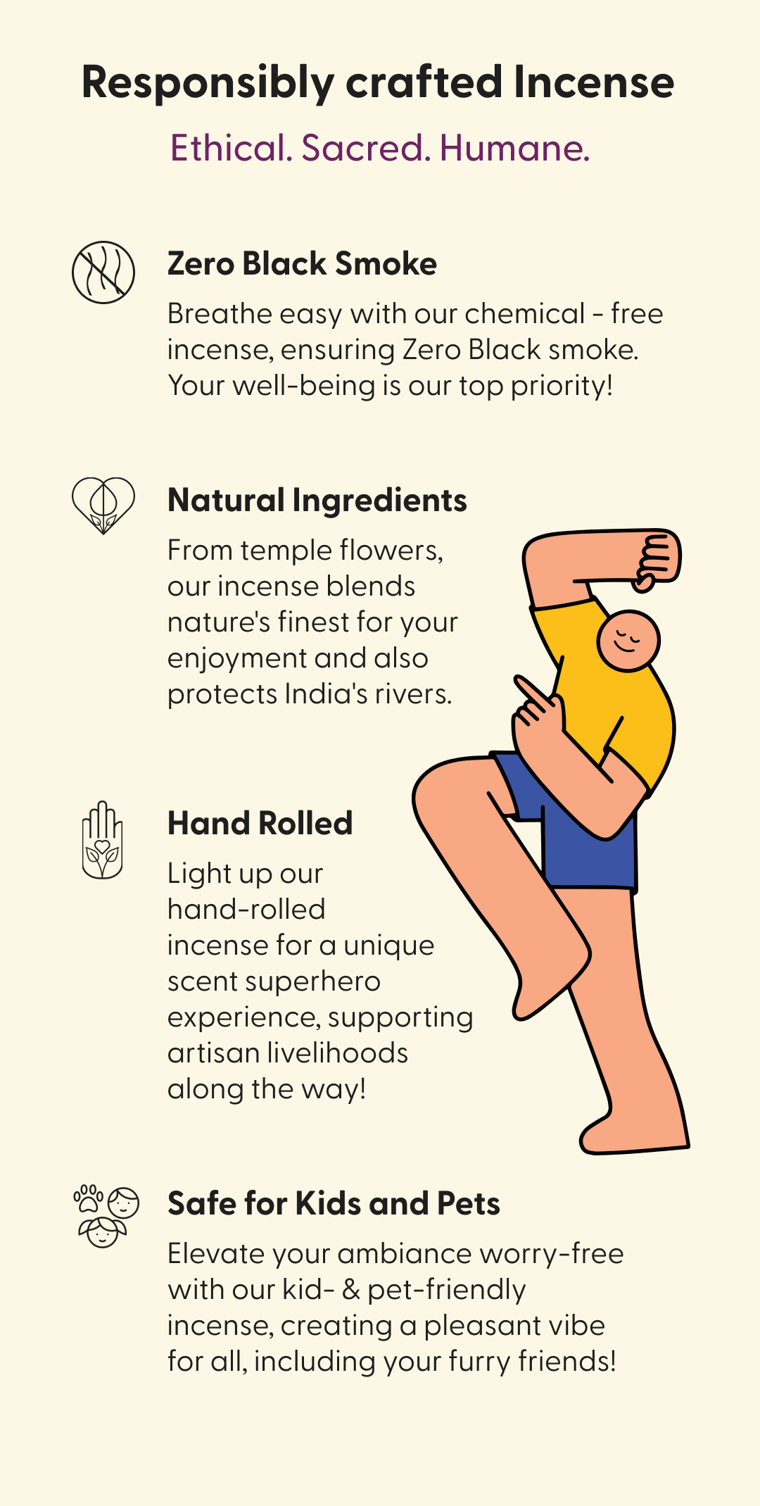 Our incense blends nature's best – even flowers from temples and markets! It's not just about fragrance, it's our mission to keep India's rivers fresh. So, enjoying our scents makes you a nature hero too!
